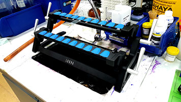Slides are placed into Luova Slide Stainer. No loose positioning slides that risk falling into the sink.